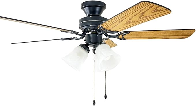 - 4枚羽根の製品に比べワンランク上の風格。5枚の羽根と重厚な仕上げのブラック塗装を施したボディ、そして厚手のガラスシェード付きE26口金ソケット3灯による高級感あふれる外観を持ち、高性能ACモーターによる静かで滑らかなファン動作を特徴とするプルスイッチ付きシーリングファンライト。暖房時にも冷房時にもサーキュレーション効果は4枚羽根の製品に比べ高いので、回転数を若干下げることができ、静粛性に優れています。